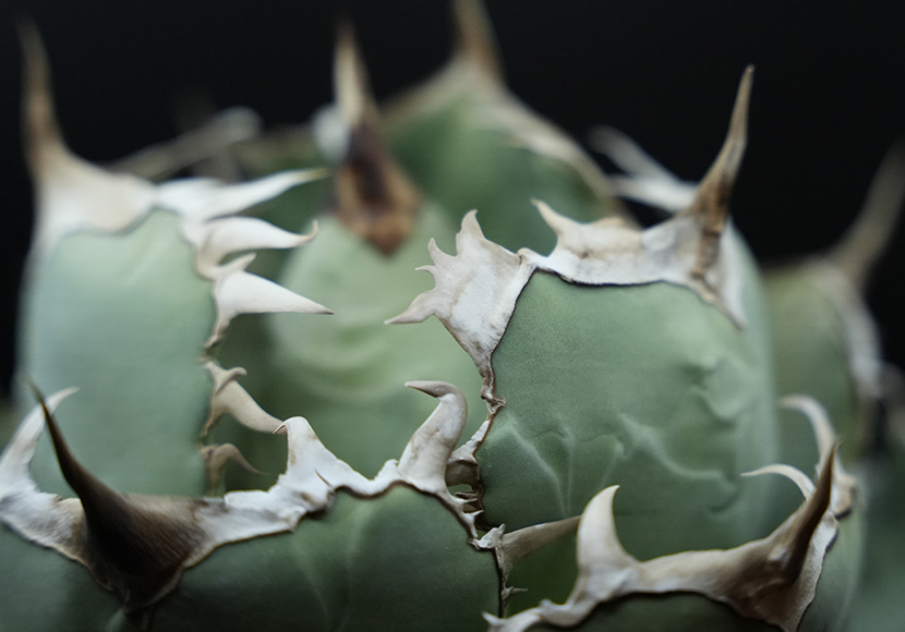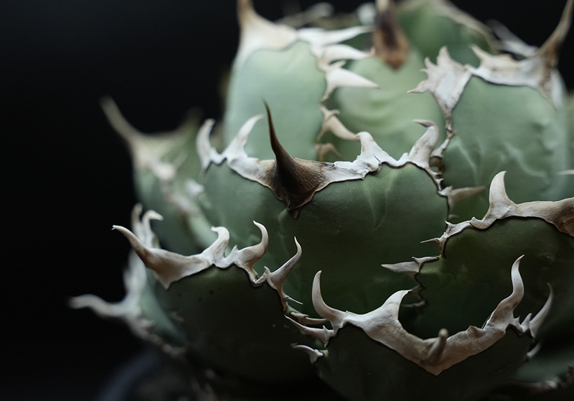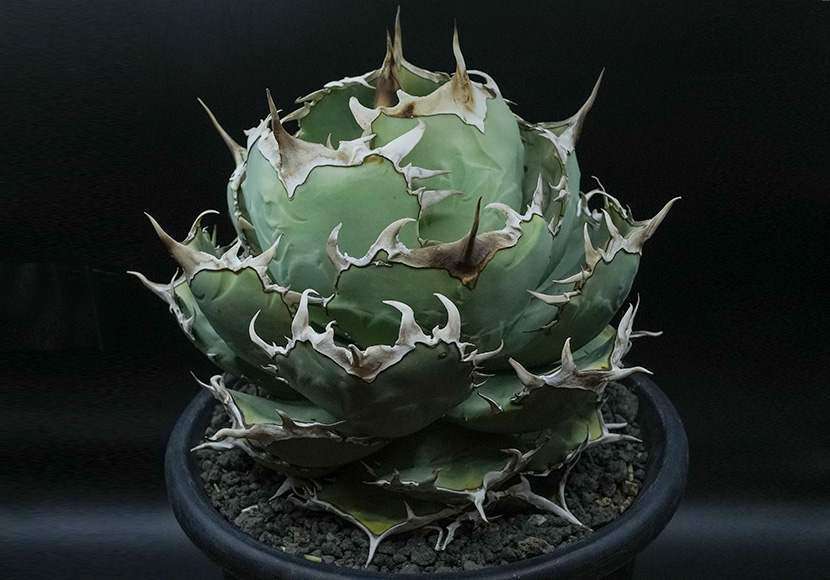 台湾のナーサリー「LIZE(リゼ)」産。「黒羽毛」は、台湾のナーサリー・リゼ(LIZE)が育成したアガベ・チタノタの選抜品種です。白色の狂刺巌龍からの突然変異とされ、展開するトップスパインが黒くなるのが特徴です。同じくリゼからリリースされた「羽毛」とは異なる系統で、羽毛が台湾中に広く流通しているのに対し、黒羽毛は流通量が少なく、希少性が高いとされています。