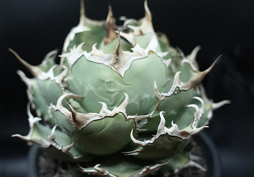 葉は肉厚で、鋭い鋸歯が際立ち、全体的に引き締まった印象を与えます。強光下での管理により、株の締まりが良くなり、特徴的な黒いトップスパインがより際立ちます。風通しの良い環境と適切な水管理を心がけることで、健全な成長が期待できます。